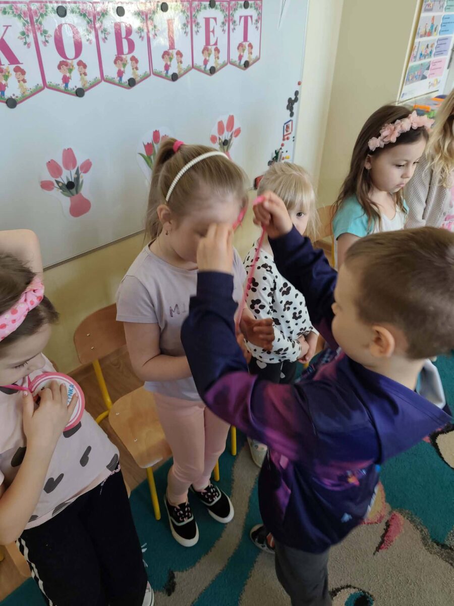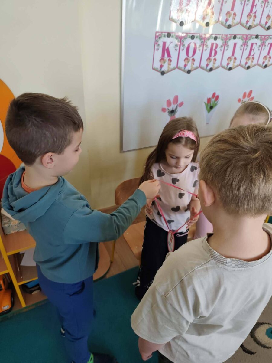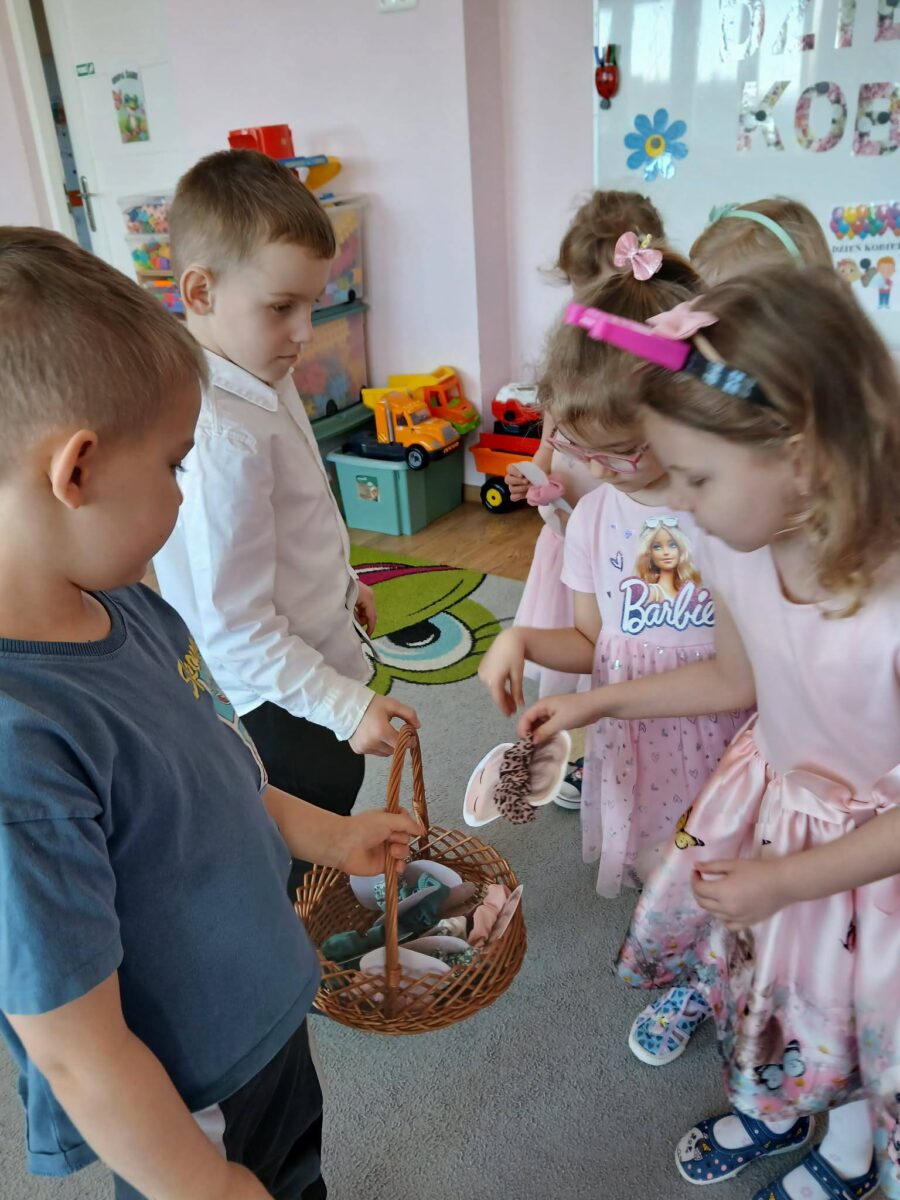Dzień Kobiet w przedszkolu upłynął w radosnej i miłej atmosferze. Dzieci z grup Motylki, Misie, Żabki oraz Tygryski wspólnie świętowały ten wyjątkowy dzień, składając serdeczne życzenia i wręczając przygotowane upominki.